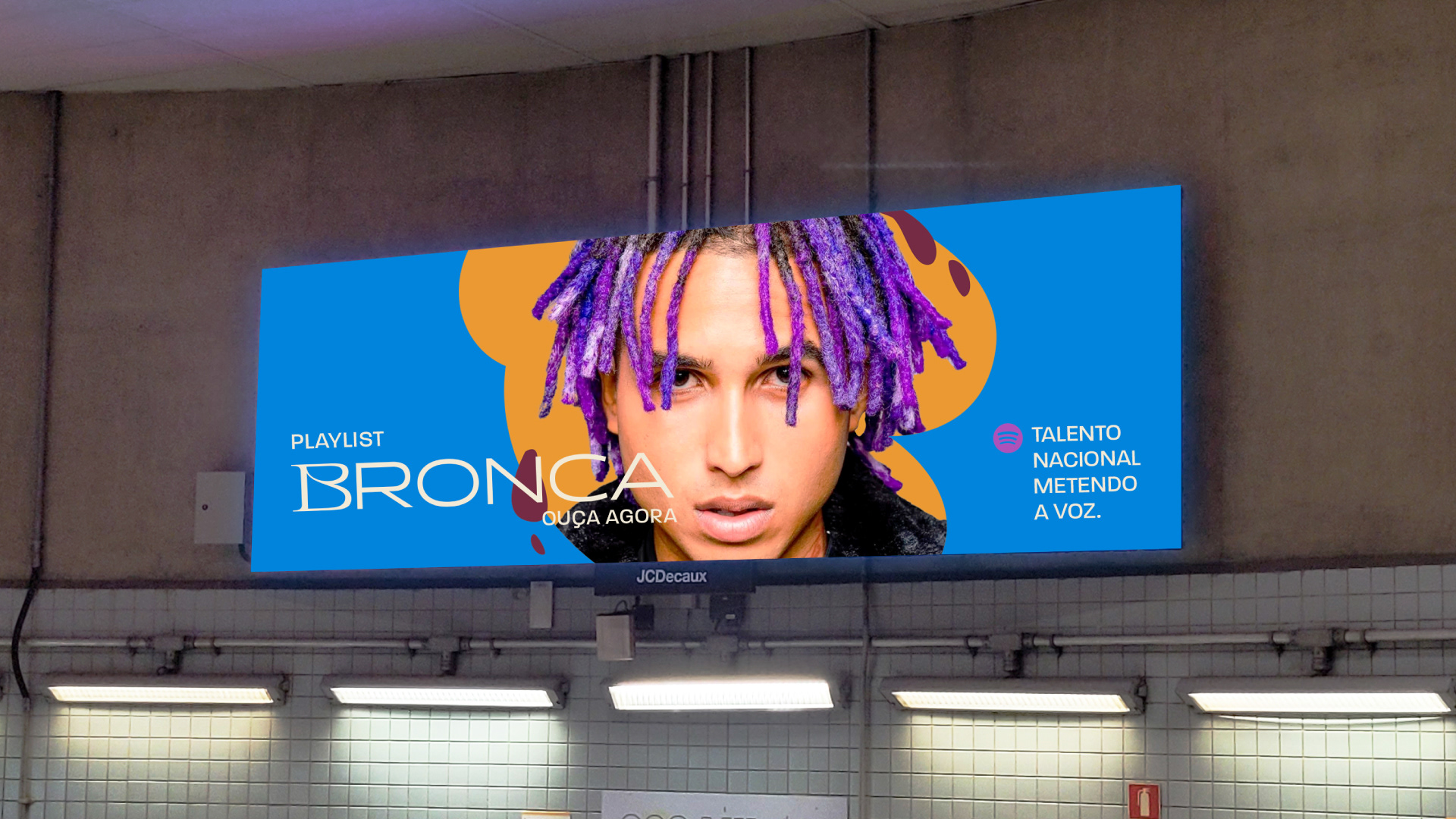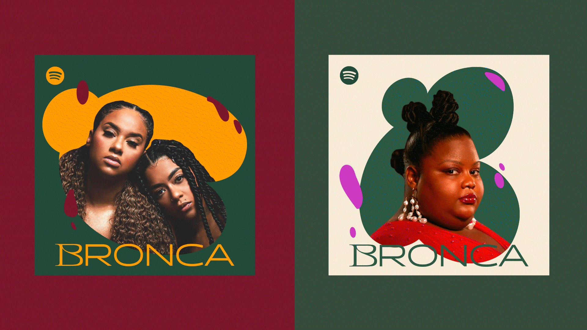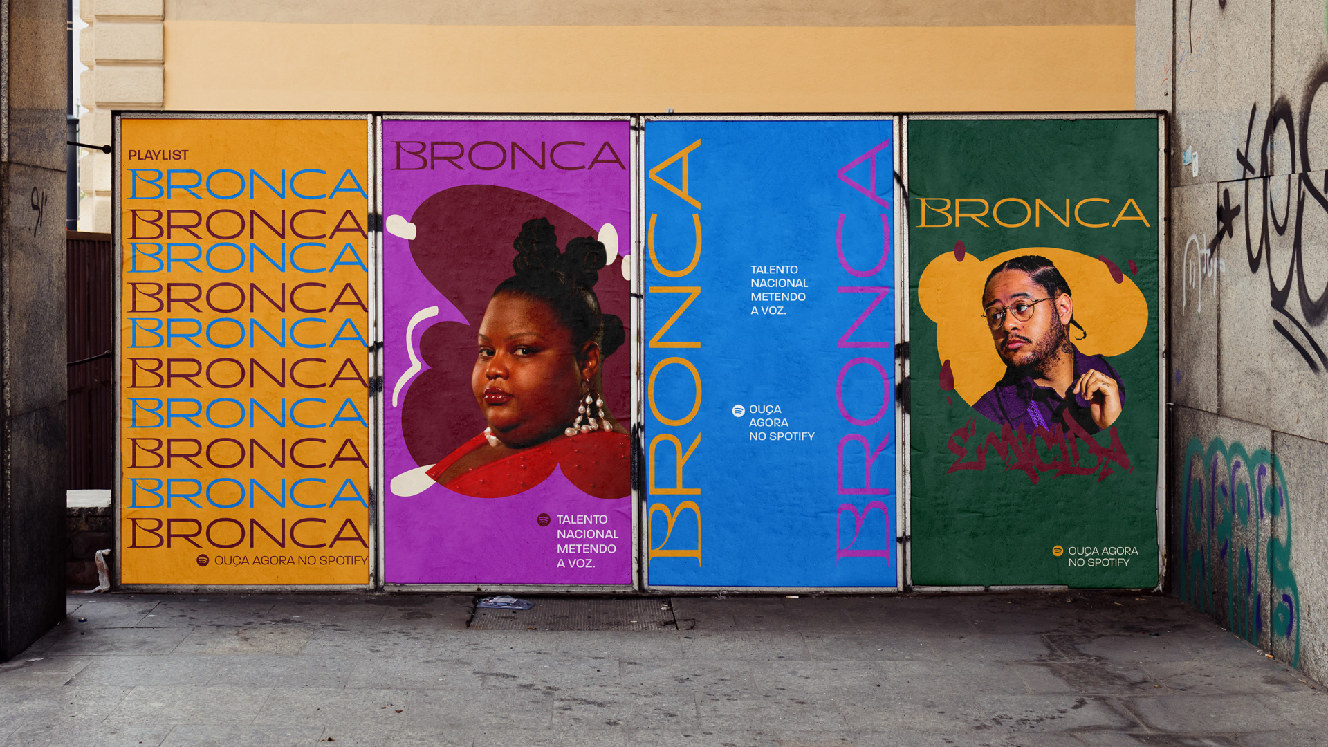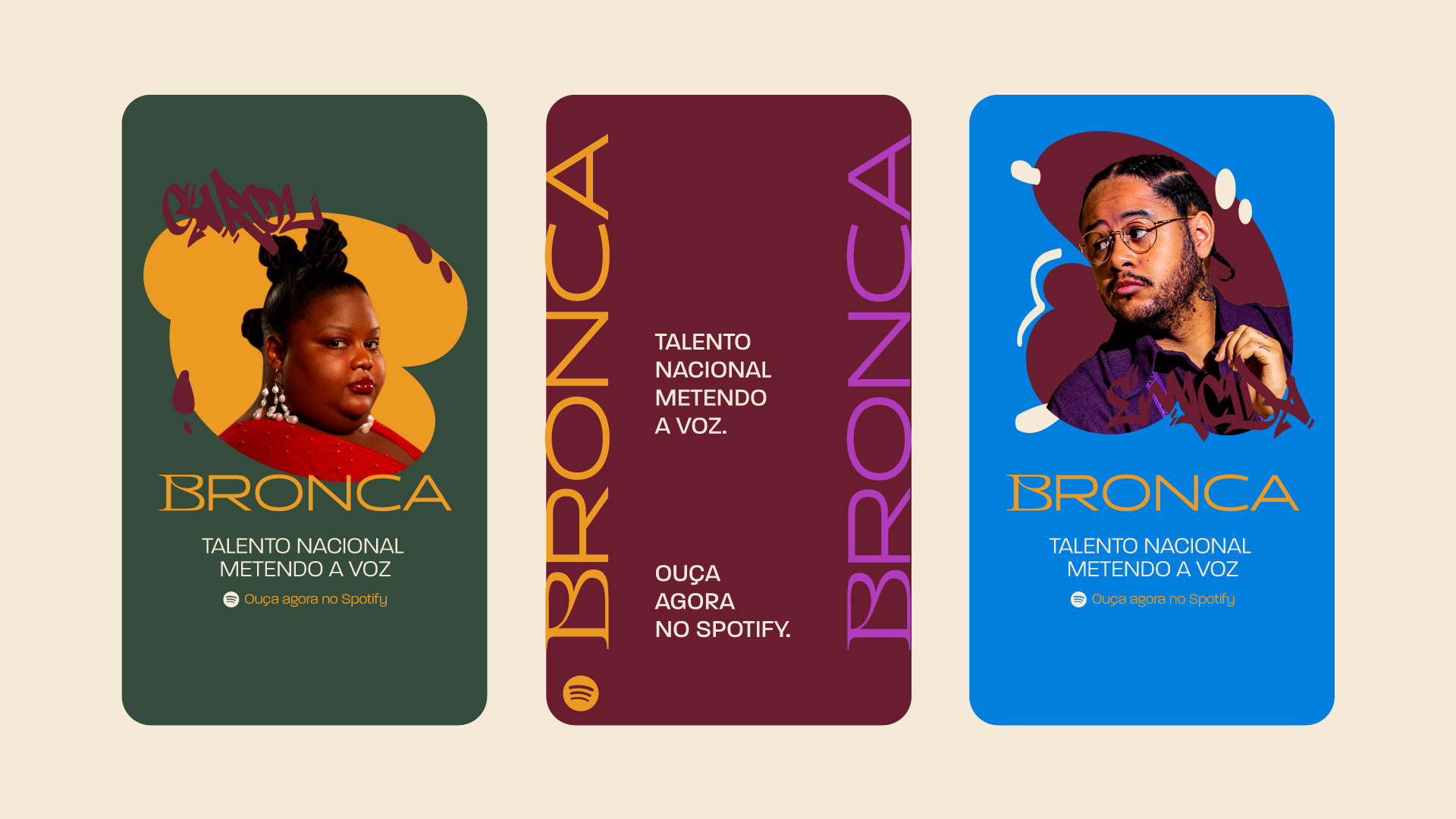 Eu, Giovanna Almeida Ramos, juntamente com Luiz Miguel e Maria Carolina Pillat, tivemos a tarefa de criar a identidade visual da playlist "Bronca", que é atualizada semanalmente, destacando um artista diferente a cada vez. Alguns aspectos foram fundamentais para o projeto: construir um sistema coeso, adaptável a diferentes artistas, ter um logo visível e legível e, ao mesmo tempo, representar a essência do hip-hop.