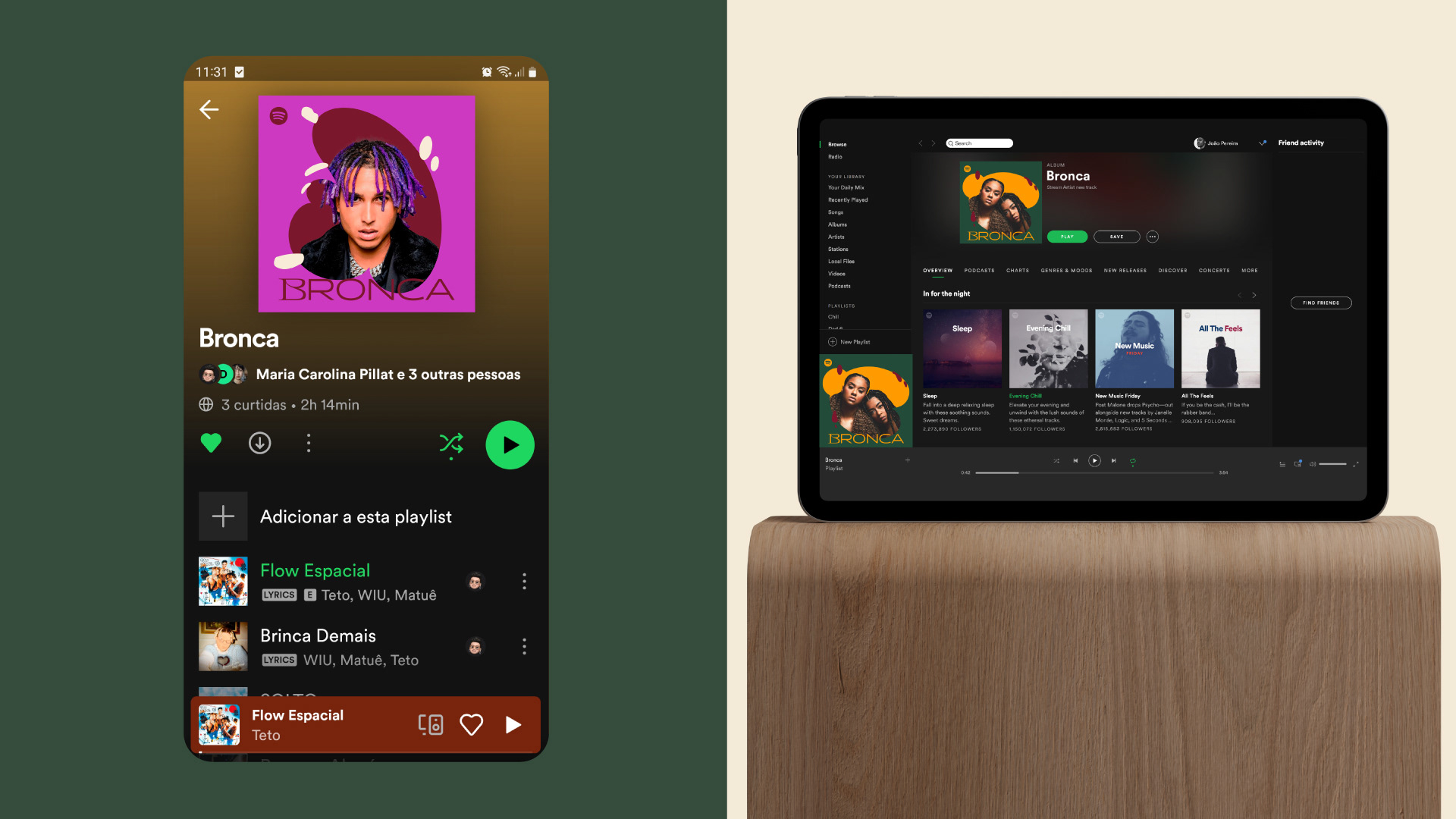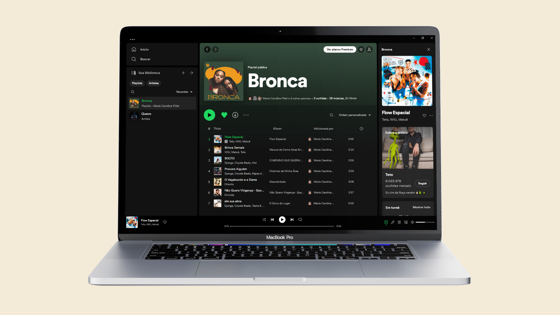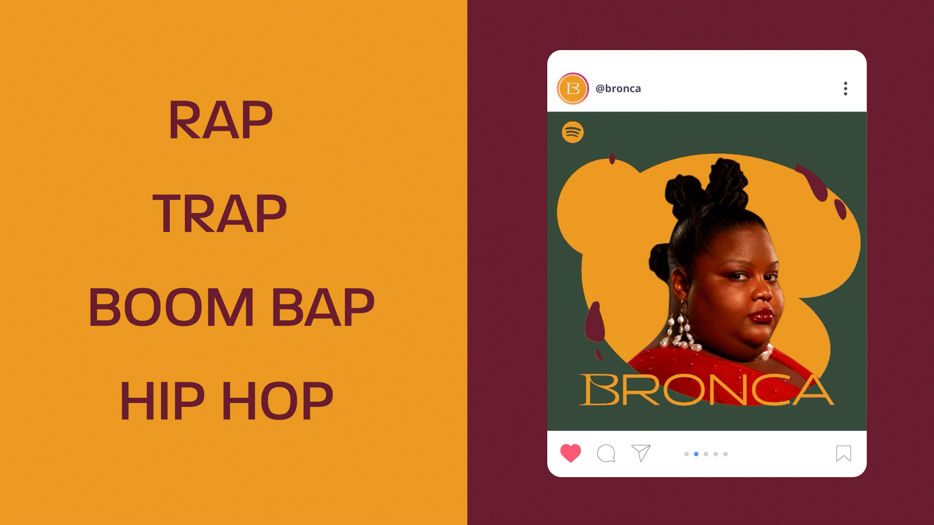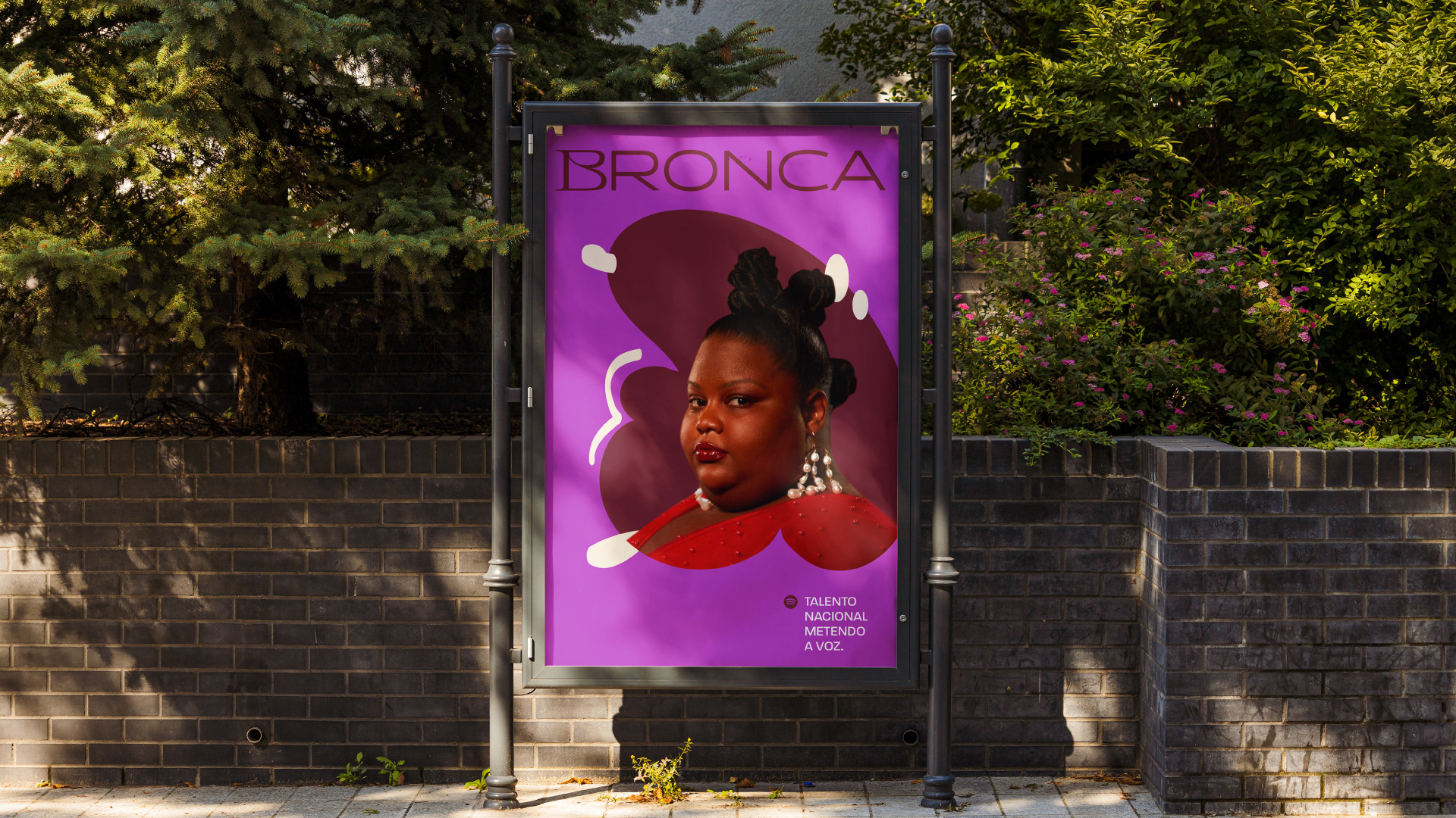 Eu, Giovanna Almeida Ramos, juntamente com Luiz Miguel e Maria Carolina Pillat, tivemos a tarefa de criar a identidade visual da playlist "Bronca", que é atualizada semanalmente, destacando um artista diferente a cada vez. Alguns aspectos foram fundamentais para o projeto: construir um sistema coeso, adaptável a diferentes artistas, ter um logo visível e legível e, ao mesmo tempo, representar a essência do hip-hop.